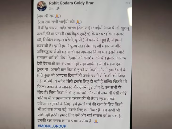 Soon after the shooting, a post allegedly from gangster Goldy Brar’s group surfaced online. The post, shared by gang member Rohit Godara, claimed responsibility for the firing. The message went beyond just owning up, it issued a direct threat.